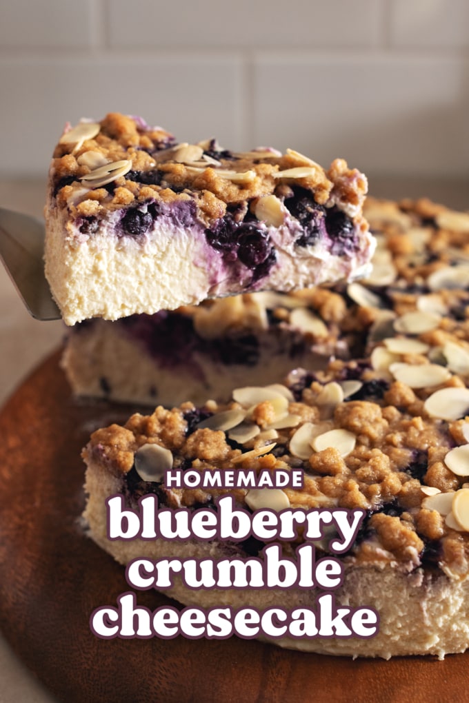 This blueberry crumble cheesecake is a creamy, crustless cheesecake made with fresh or frozen blueberries and topped with a buttery crumble topping.