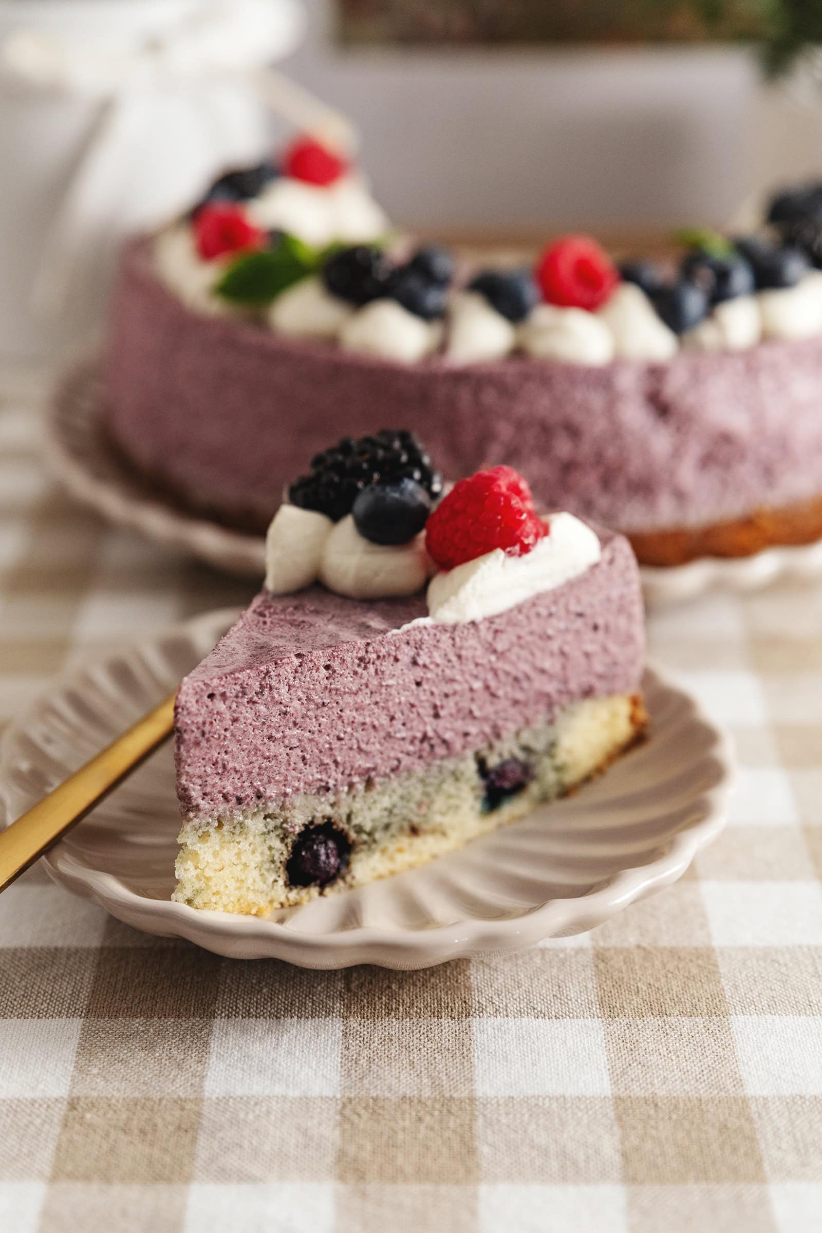 This blueberry mousse cake is made with a blueberry-studded vanilla cake base, an airy no-bake blueberry mousse layer, and fresh whipped cream and berries on top.
