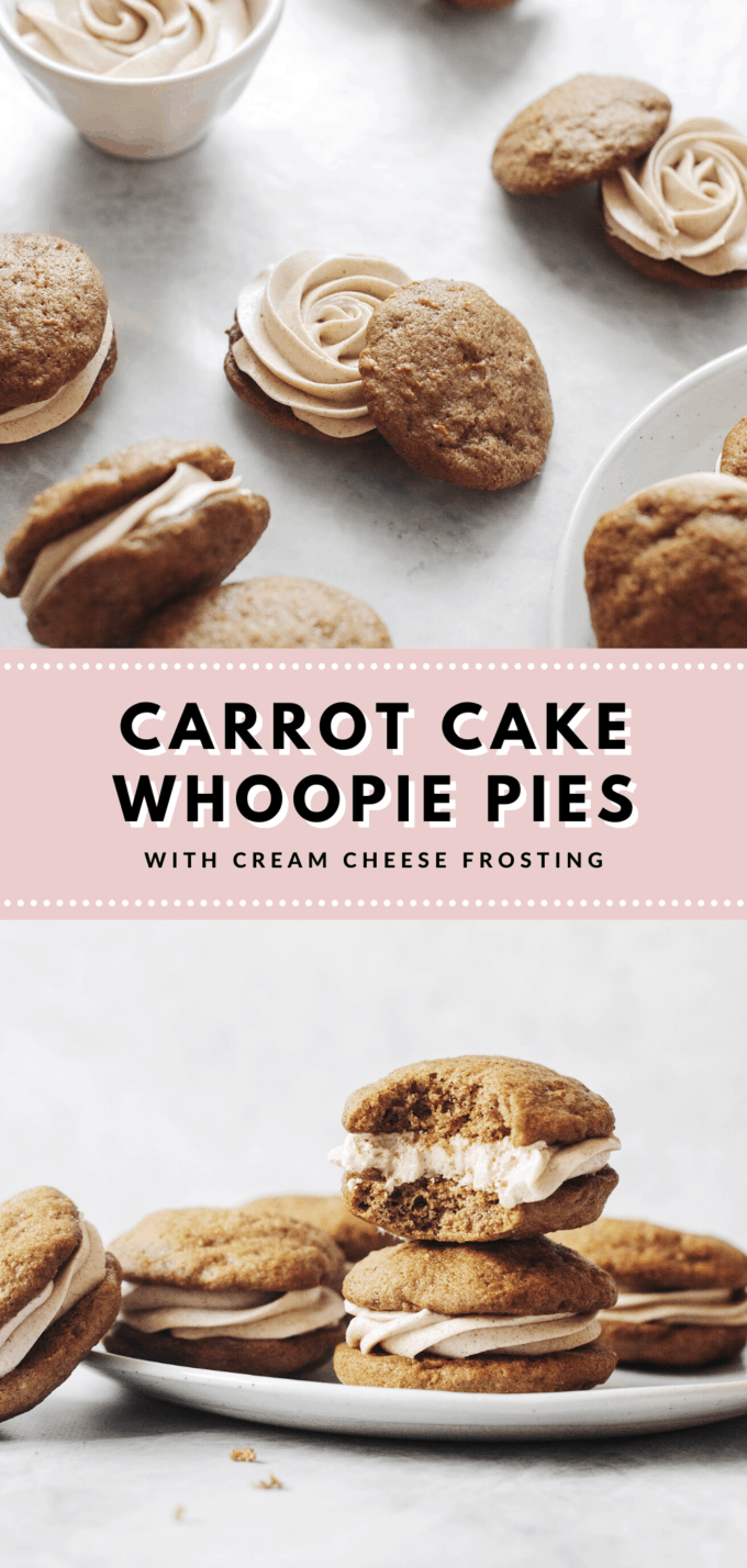 - They're easier and faster to make than a layered carrot cake with cream cheese frosting but taste basically the same. Think of these whoopie pies as handheld, portable carrot cakes. No plates or utensils needed to eat them.