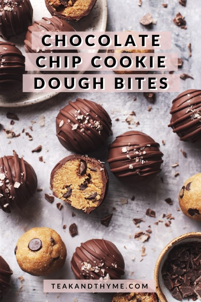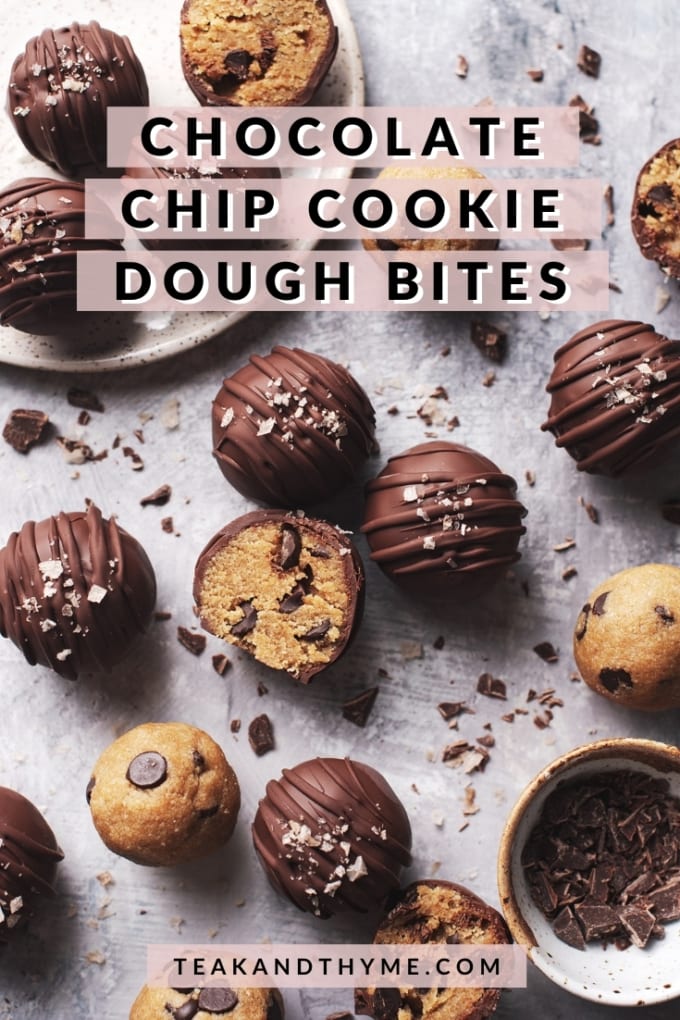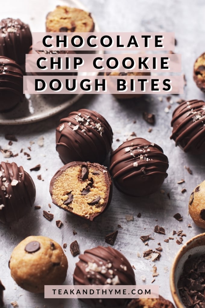 Eggless chocolate chip cookie dough bites dipped in a dark chocolate shell and sprinkled with flaky salt.