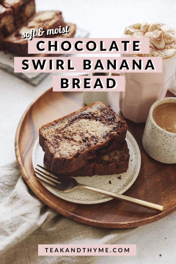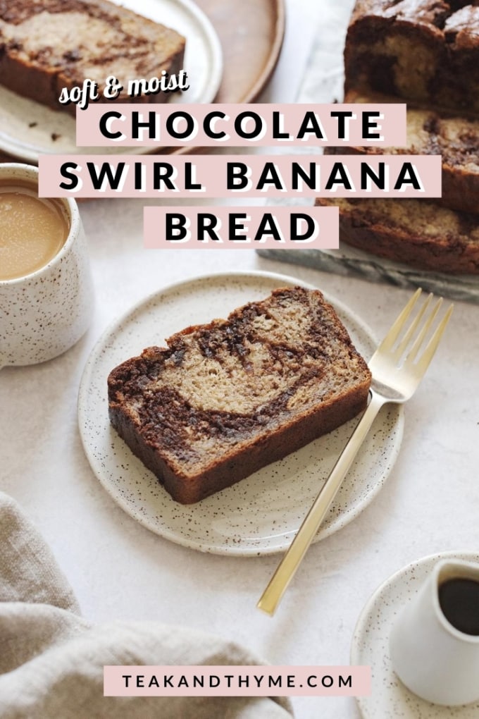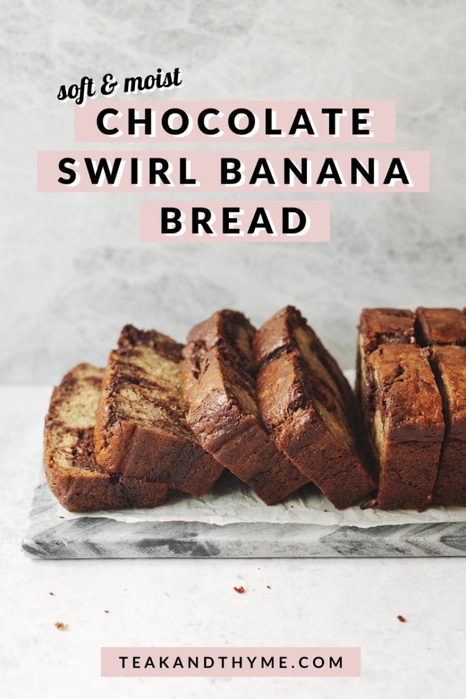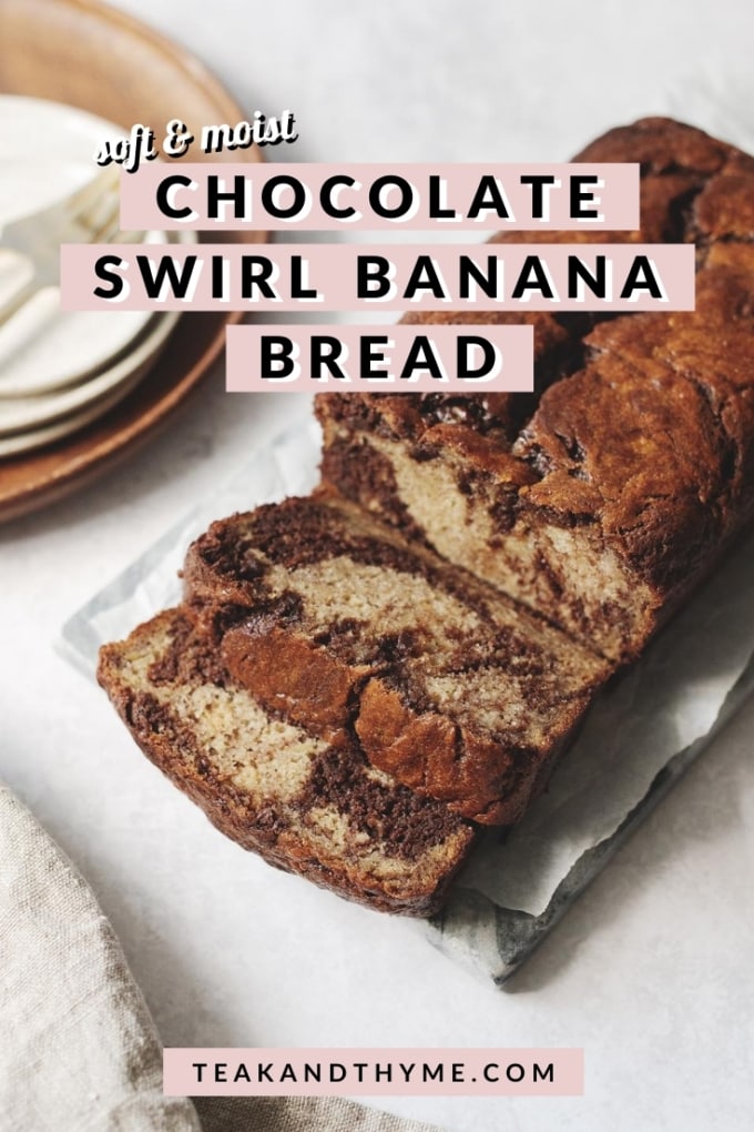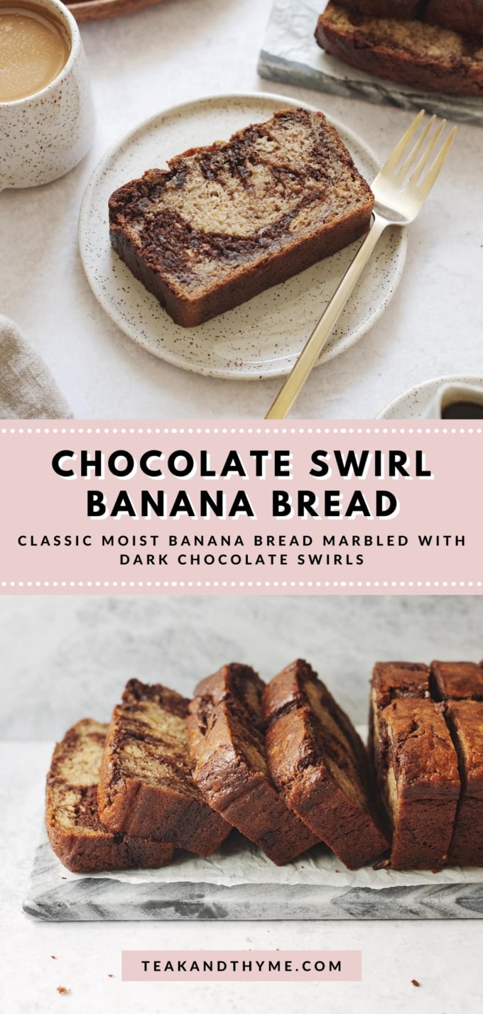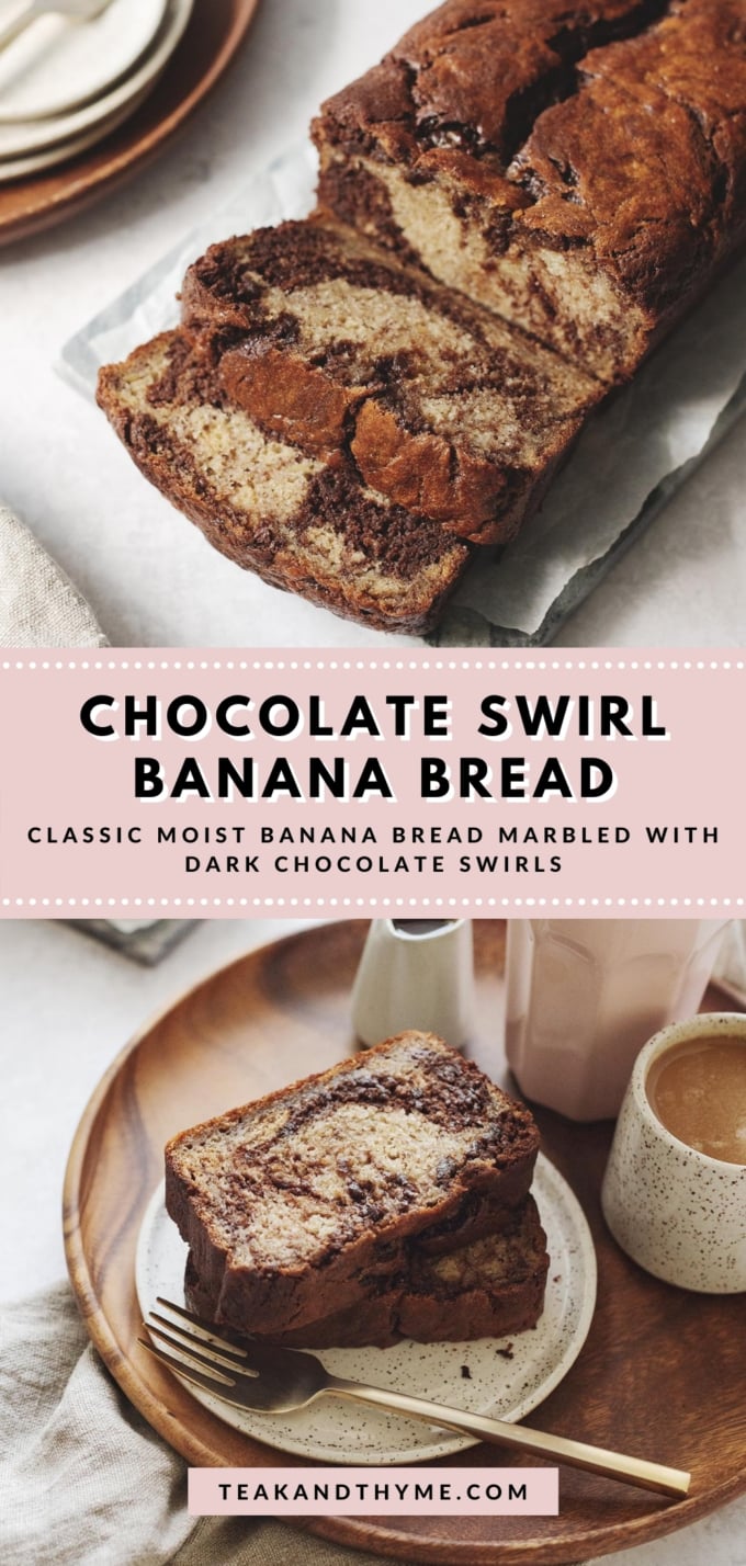 My favourite classic, moist banana bread marbled with swirls of dark chocolate running throughout. What's not to love? This chocolate swirl banana bread makes a perfect sweet breakfast loaf or snack with a cup of coffee.