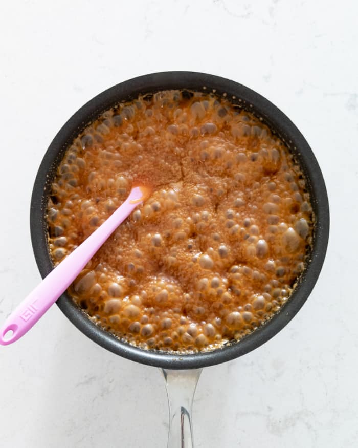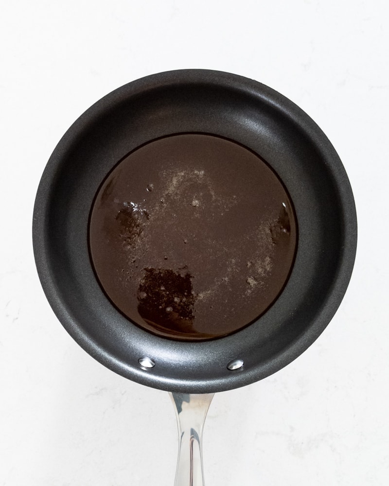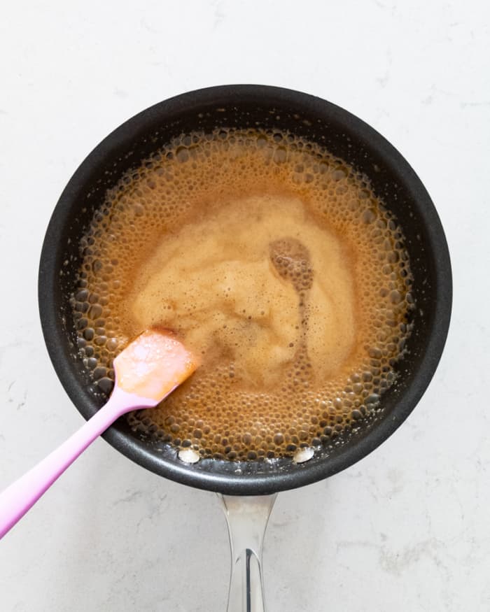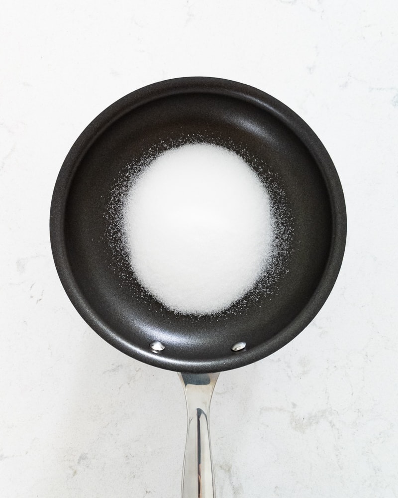 - Heat a small saucepan of sugar on medium heat until completely melts and deepens to a light brown colour.