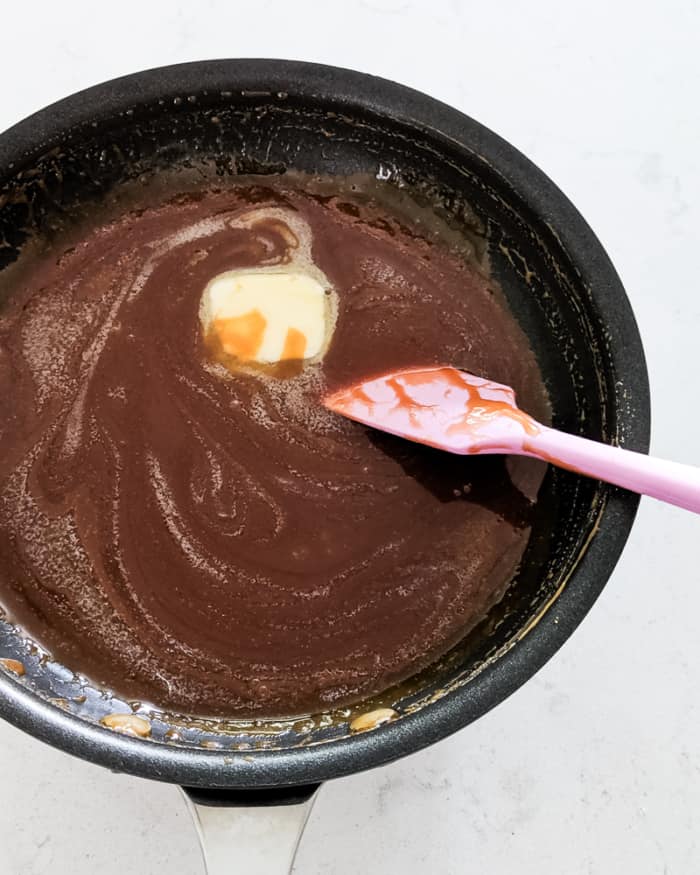 - Stir in a tablespoon of butter at a time until it is completely melted and combined. If you want salted caramel sauce, stir in the salt at this time.