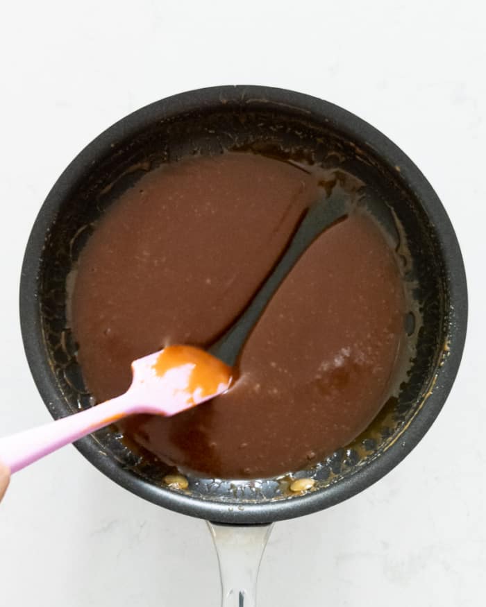 Drag a spatula through the caramel sauce across the bottom of the pan. The caramel is at the right consistency when the caramel parts on both sides and you can see the bottom of the pan briefly before the caramel slowly oozes back together. Pour the caramel sauce into a small container to cool completely.