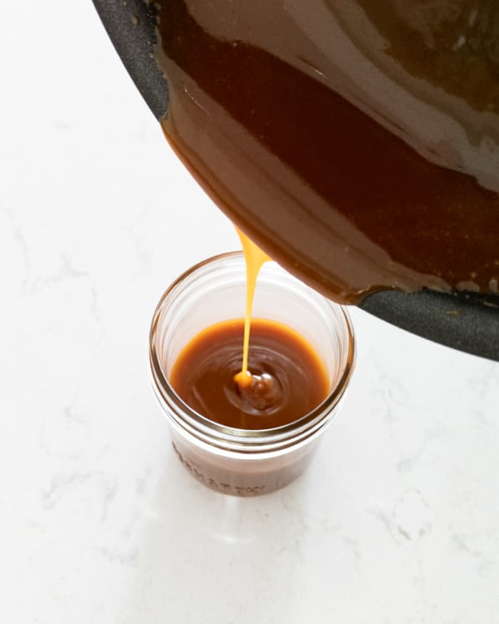 - When the caramel becomes thick enough to part when a spatula is dragged through it and the caramel slowly oozes back together, pour it into a small container and let cool completely. When it's hot, it may seem like it's too thin and runny but it thickens up considerably as it cools.