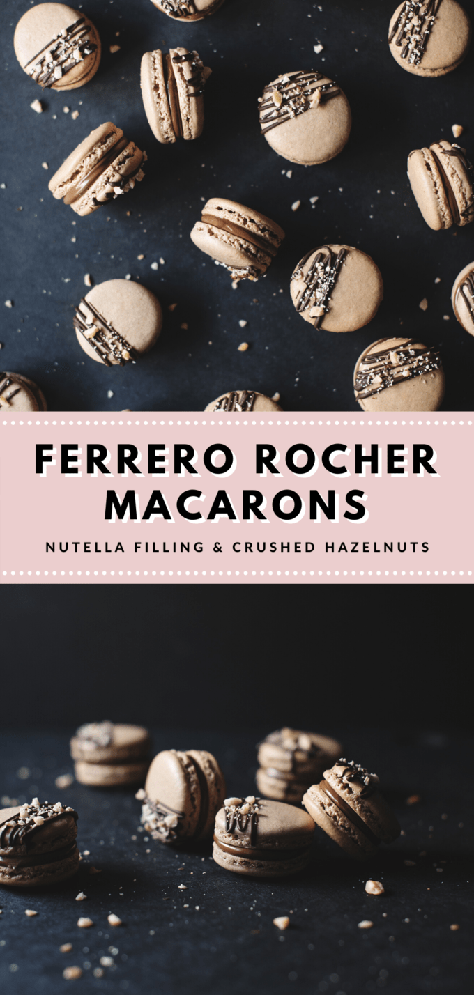 These ferrero rocher macarons taste just like the chocolates. They feature chocolate macaron shells, hazelnut nutella filling, topped with chocolate drizzle and crushed hazelnuts.