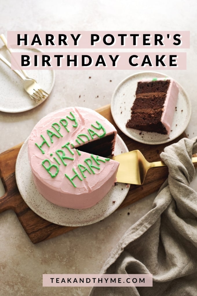 This rendition of Harry Potter's 11th birthday cake has soft and fluffy buttermilk chocolate cake layers, creamy chocolate ganache, pink cream cheese frosting, and green lettering. It's not too sweet due to the dark chocolate but decadent enough thanks to the layers of ganache. It made me so incredibly happy decorating and eating it and I hope it makes you feel the same way! Happy birthday Harry!