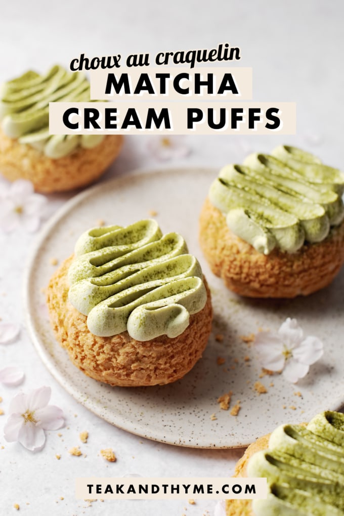 These matcha cream puffs are made with crunchy choux au craquelin shells filled with matcha diplomat cream and a matcha pastry cream center.
