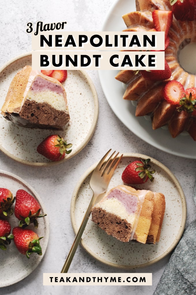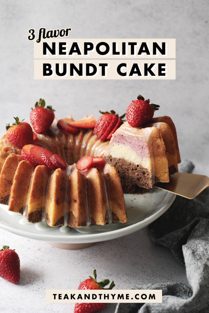 This neapolitan bundt cake is an homage to classic neapolitan ice cream with its strawberry, vanilla, and chocolate layers of soft and fluffy cake.