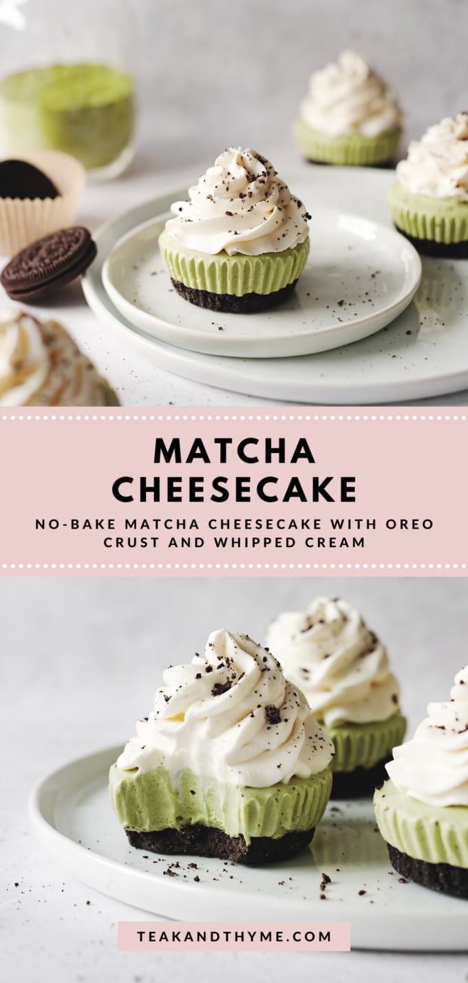 This mini no-bake matcha cheesecake pairs a creamy matcha filling with a crunchy oreo cookie crust and whipped cream topping. They go straight into the freezer for an easy treat.