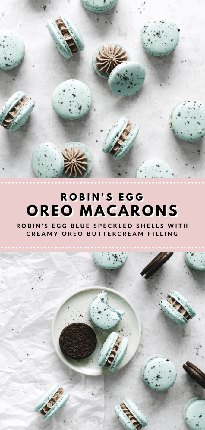 These robin's egg oreo macarons are coloured in a beautiful robin's egg blue colour, speckled with oreo crumbs, and filled with a creamy oreo buttercream.