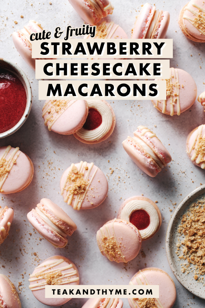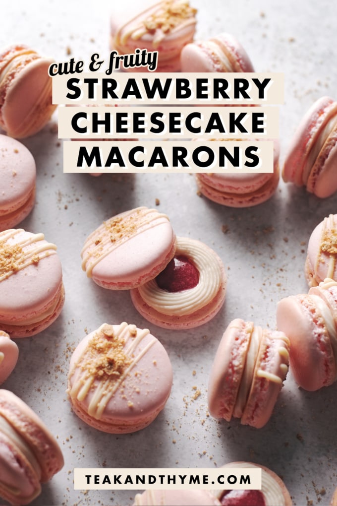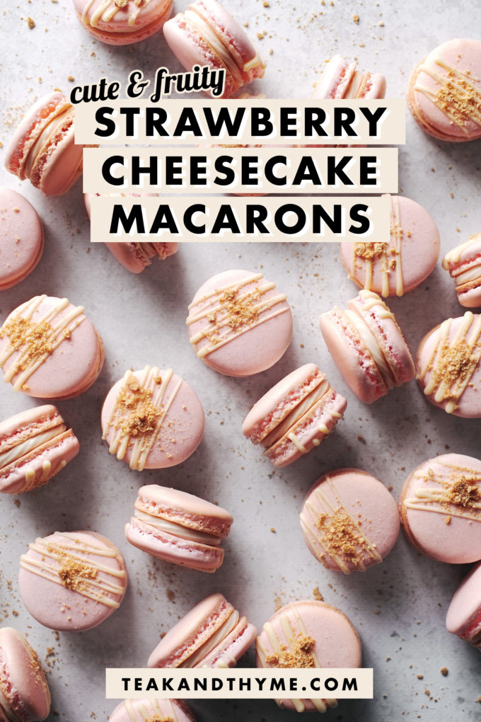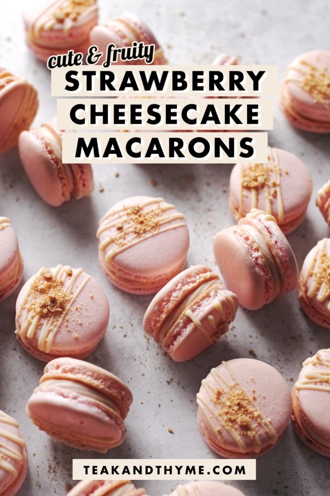 These cute pink strawberry cheesecake macarons have a cream cheese frosting, homemade strawberry jam filling, all sandwiched between two pink macaron shells with a sprinkle of graham cracker crumbs on top of white chocolate drizzle.
